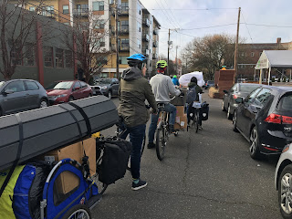 Next up: I had an opportunity to join some friends on a bike move. I was coming from a facial and don't have a cargo bike, so I did what I could with my rack and panniers, which ended up being quite a lot because I carried about 20 books and 9 duraflame logs. My load was so heavy I fell trying to get on my bike and needed a spotter for both mounting and dismounting. The fifteen or so riders carrying a ton of stuff made quite a spectacle, and also made a nice crowd for the move in after party.